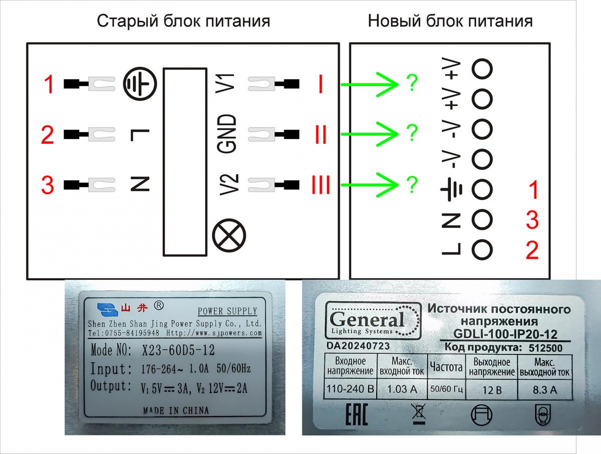 На молоке обжегся- дую на воду. Подписал все проводочки, купил блок питания. Сильно хочется уточнить, куда на какие клеммы нового блока подключать проводочки I, II и III?